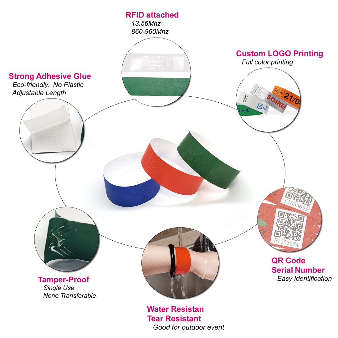 Disse armbånd er designet af førsteklasses Tyvek-materiale med en vandtæt finish og forbliver intakte i alle miljøer - fra stænkzoner og udendørs steder til VIP-lounges og kontrolsteder for publikum. Det bedste af det hele er, at de er Tilpassede event-armbånd der kan tilpasses med din branding, stregkode eller RFID-sporing, så de passer til dine unikke eventbehov.